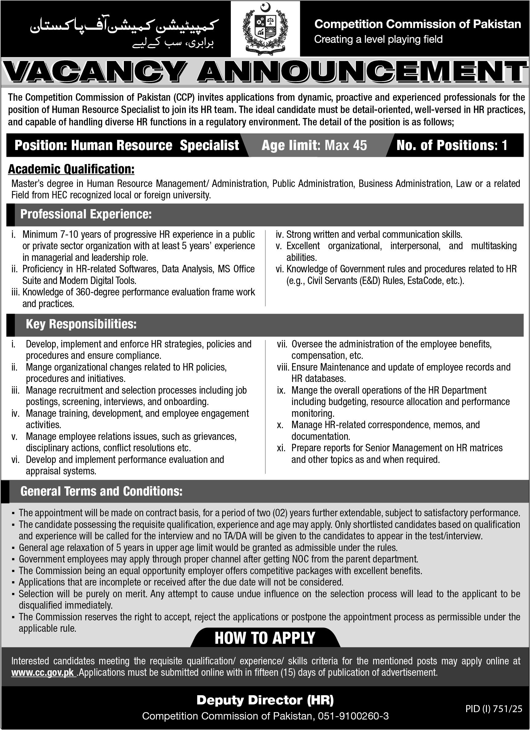 Competition Commission of Pakistan jobs advertisement dated about 27 July 2025 in daily Other Newspaper invites application for the vacant post of human resource specialist in Islamabad, islamabad Islamabad Pakistan. Persons with Master and Bachelor etc. education can apply.