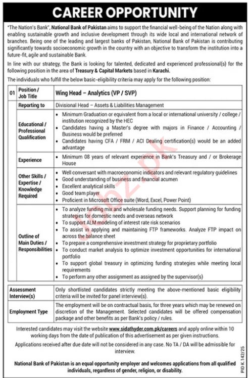 National Bank of Pakistan NBP jobs advertisement dated about 13 July 2025 in daily The News Newspaper invites application for the vacant post of wing head in Karachi, karachi Sindh Pakistan. Bachelor and Master etc. educational qualification will be preferred.