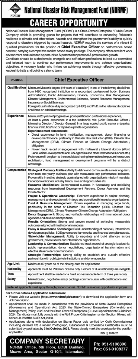 National Disaster Risk Management Fund NDRMF invites applications for job positions advertised in daily Nawaiwaqt dated 12 October 2025 for following vacancies in G-10/4 Islamabad, islamabad Islamabad Pakistan.
