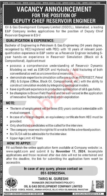 Oil & Gas Development Company Limited OGDCL Islamabad, islamabad Islamabad Pakistan invites applications from eligible candidates for the post of deputy chief reservoir engineer as per advertisement of October 27, 2024 published in daily Jang Newspaper. Educational qualifications required B.E and Bachelor etc.