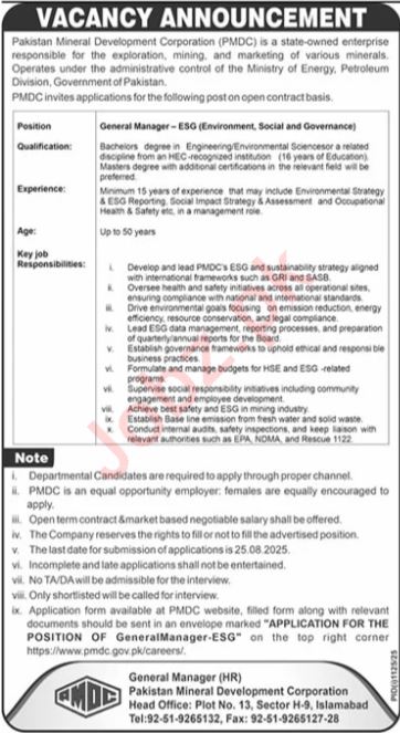 Latest Government jobs in Pakistan Mineral Development Corporation in Management and others can be applied till 25 August 2025 or as per closing date in newspaper ad. Read complete ad online to know how to apply on latest Pakistan Mineral Development Corporation job opportunities.
