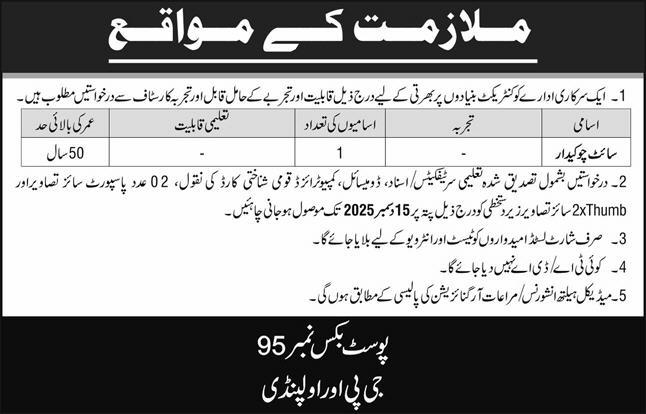 Post Box No 95 GPO Rawalpindi Jobs 2025 for Site Chowkidar