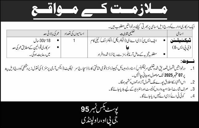 Post Box No 95 GPO Rawalpindi Jobs 2025 for Technician