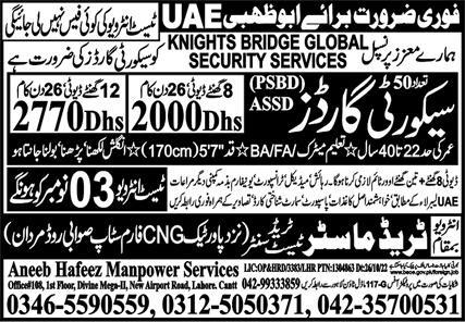 Aneeb Hafeez Manpower Services jobs advertisement dated about 2 November 2022 in daily Express Newspaper invites application for the vacant post of security guard in Abu Dhabi, abu dhabi UAE. Candidates with Middle and Matric etc. educational background will be preferred.