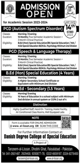 Danish Degree College of Special Education has announced admissions 2023 for Post Graduate Diploma, B.Ed. Students who want to take admissions in Danish Degree College of Special Education Faisalabad Punjab Pakistan for academic year 2023 to continue education in Science College can apply. Students for admissions in P.G Diploma and B.ed can apply for online or campus classes as per Private institute criteria till admission closing date November 1, 2023. Read newspaper ad for exact details.
