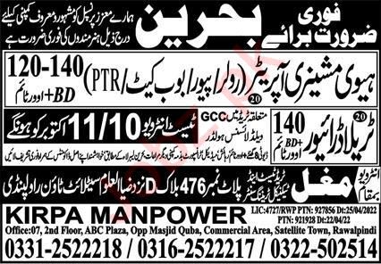 Kirpa Manpower Services Bahrain, bahrain Bahrain invites applications from eligible candidates for the post of heavy machinery operator and traila driver as per advertisement of October 9, 2022 published in daily Express Newspaper. Educational qualifications required Middle, Matric and Primary etc.