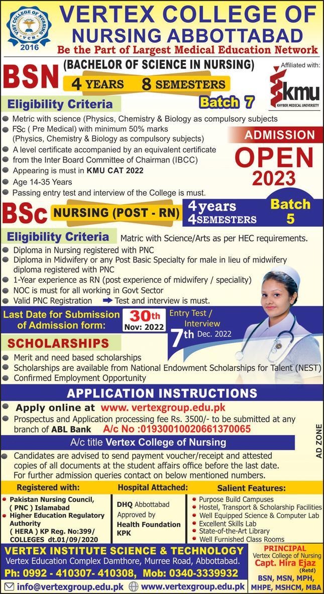 Vertex College of Nursing admissions 2022 for Bachelor of Science in Nursing BSN, BSc Nursing Post RN has been announced. Students who want to take admissions in Vertex College of Nursing Abbottabad Khyber Pakhtunkhwa KPK Pakistan for academic year 2022 to continue education in Medical College can apply. Eligible students for fulfilling criteria for admissions in BS and BSN can enroll as per Private admission policy 2022 till closing date 30 November 2022. Read newspaper ad for exact details.