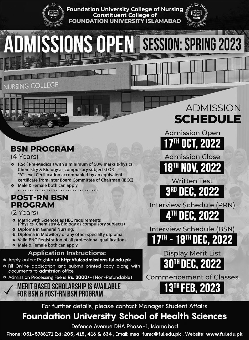Foundation University Islamabad BSN Program, Post RN BSN admissions 2022 has been announced. Eligible students who qualify as per admission criteria in Foundation University Islamabad Islamabad Islamabad Pakistan can apply in Medical University for academic year 2022. Students who want to enroll for academic session 2022 in BSN and Others qualification and admission criteria for Private institute can apply till last date 18 November 2022. Read newspaper ad for exact details.