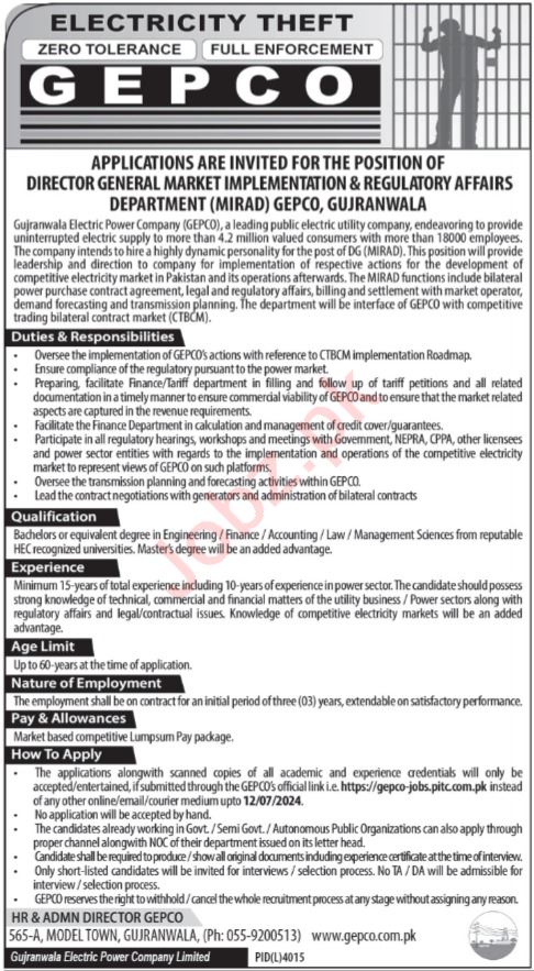 Gujranwala Electric Power Company GEPCO jobs advertisement dated about 16 June 2024 in daily Express Tribune Newspaper invites application for the vacant post of director general in Gujranwala, gujranwala Punjab Pakistan. Persons with Bachelor etc. education can apply.
