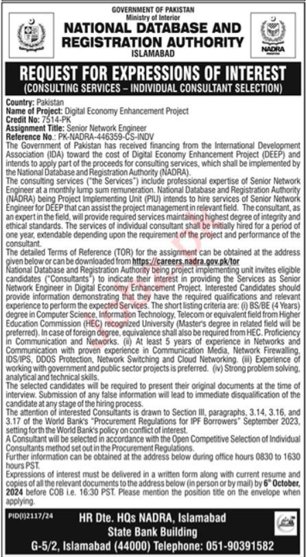 National Database & Registration Authority NADRA Islamabad, islamabad Islamabad Pakistan invites applications from eligible candidates for the post of network engineer as per advertisement of September 22, 2024 published in daily Dunya Newspaper. Educational qualifications required Bachelor and Master etc.