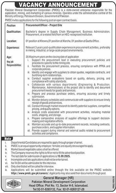 Pakistan Mineral Development Corporation latest Government Management jobs and others can be applied till 15 September 2025 or as per closing date in newspaper ad. Read complete ad online to know how to apply on latest Pakistan Mineral Development Corporation job opportunities.