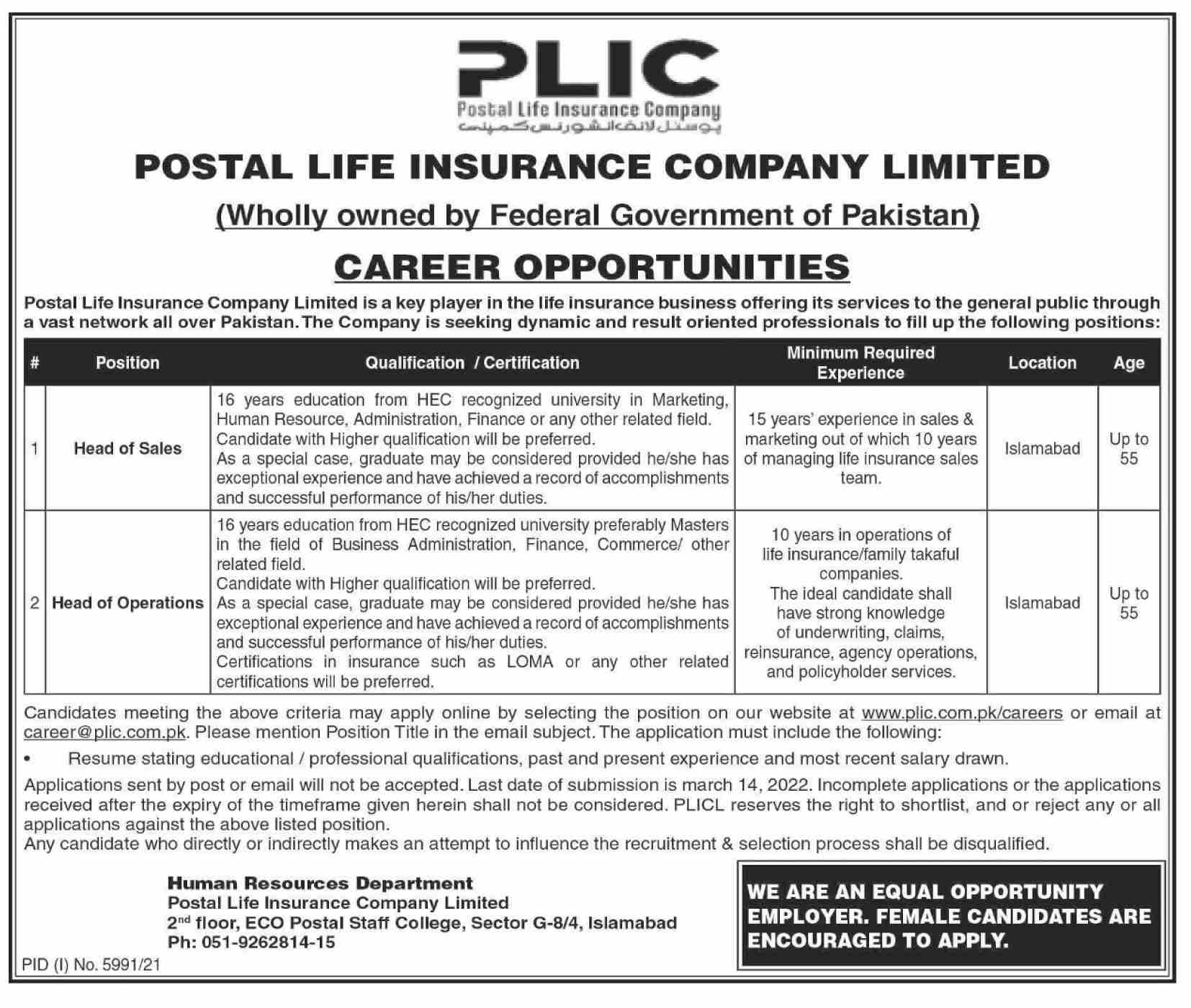 Postal Life Insurance Company invites applications for job positions advertised in daily Dawn dated 27 February 2022 for following vacancies in Islamabad, islamabad Islamabad Pakistan.