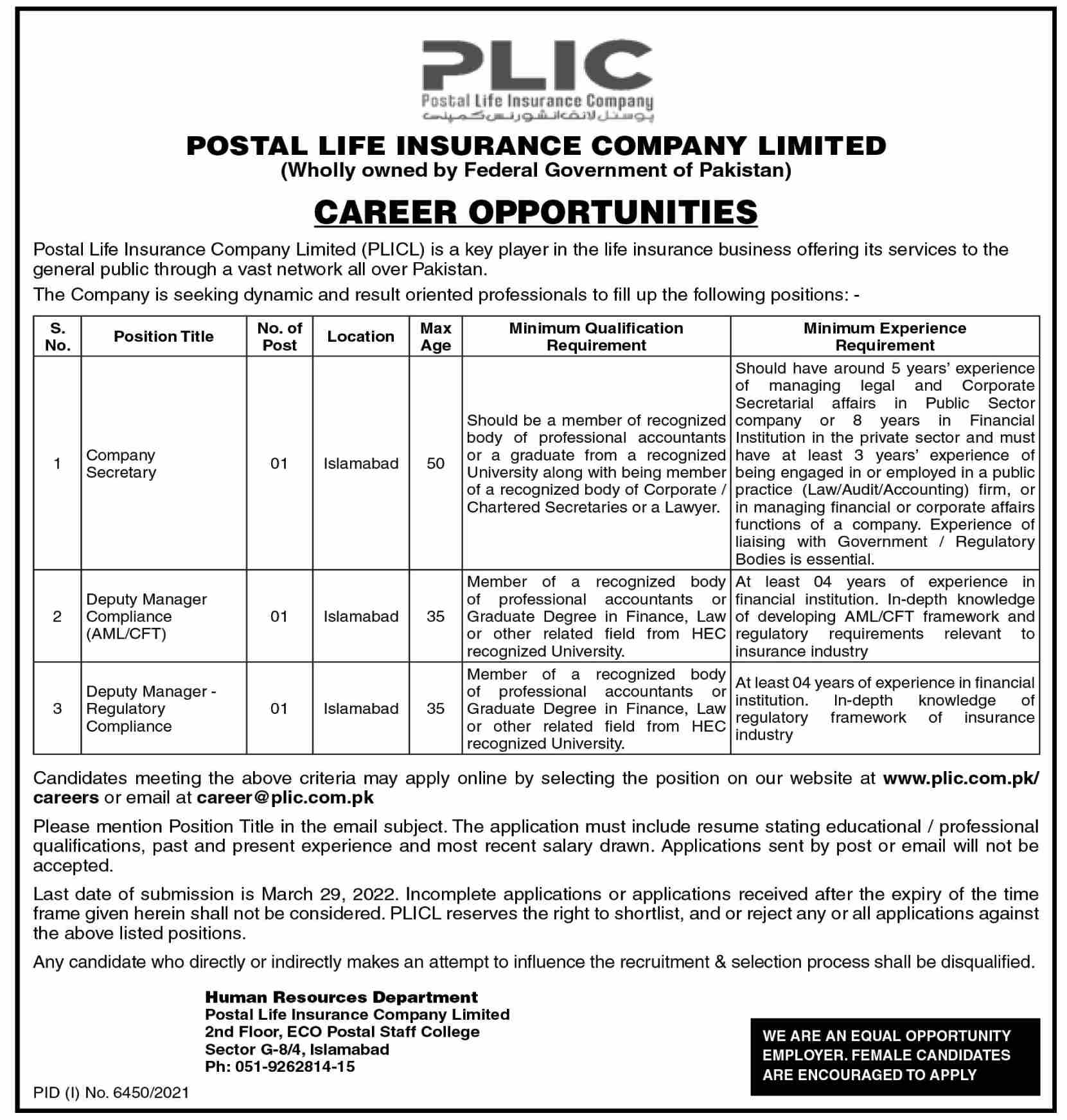 Postal Life Insurance Company invites applications for job positions advertised in daily Dawn dated 13 March 2022 for following vacancies in Islamabad, islamabad Islamabad Pakistan.
