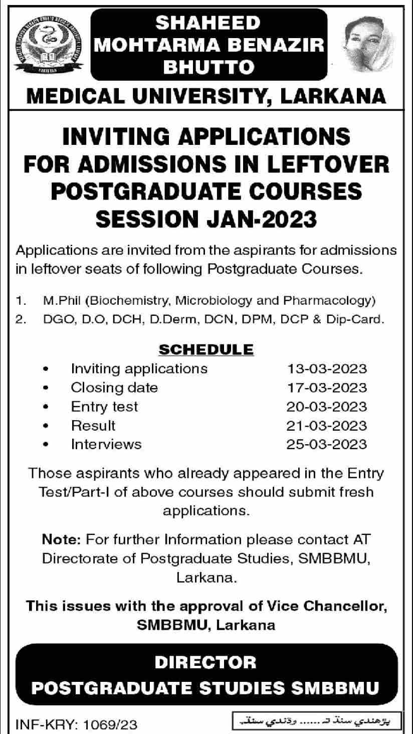 Shaheed Mohtarma Benazir Bhutto Medical University MPhil Biochemistry, MPhil Microbiology, MPhil Pharmacology, DGO, DO, DCH, D.Derm, DCN, DPM, DCP, Diploma in Cardiology admissions 2023 has been announced. Eligible students who qualify as per admission criteria in Shaheed Mohtarma Benazir Bhutto Medical University Larkana Sindh Pakistan can apply in Medical University for academic year 2023. Eligible candidates for admissions in Mphil and Diploma can apply as per Government institute criteria and before closing date 17 April 2023 after reading advertisement online. Read newspaper ad for exact details.