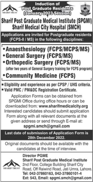 Sharif Post Graduate Medical Institute SPGMI Anaesthesiology, General Surgery, Orthopedic Surgery, Community Medicine admissions 2022 has been announced. Sharif Post Graduate Medical Institute SPGMI Lahore Punjab Pakistan welcomes students to apply for admissions in academic year 2022 in Medical University. Students for admissions in MBBS, MS and FCPS can apply for online or campus classes as per Private institute criteria till admission closing date December 28, 2022. Read newspaper ad for exact details.