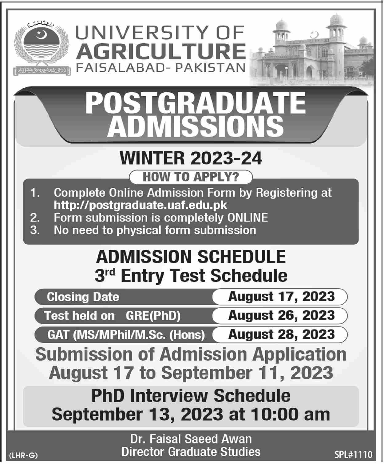 University of Agriculture UAF MS, MSc, MPhil admissions 2023 has been announced. Students who want to take admissions in University of Agriculture UAF Faisalabad Punjab Pakistan for academic year 2023 to continue education in Science University can apply. Students for admissions in MS, Mphil and M.sc can apply for online or campus classes as per Government institute criteria till admission closing date August 17, 2023. Read newspaper ad for exact details.
