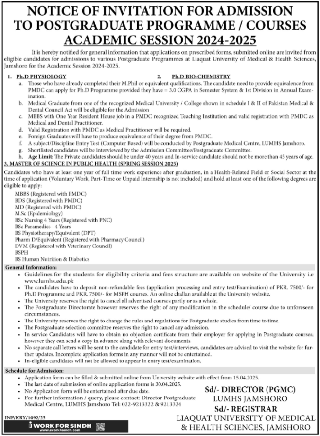 Liaquat University of Medical & Health Sciences Postgraduate Courses admissions 2025 has been announced. Students who want to take admissions in Liaquat University of Medical & Health Sciences Jamshoro Sindh Pakistan for academic year 2025 to continue education in Science University can apply. Students for admissions in can apply for online or campus classes as per Private institute criteria till admission closing date. Read newspaper ad for exact details.