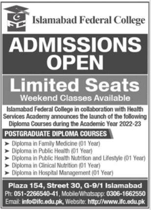 Islamabad Federal College IFC Diploma in Family Medicine, Diploma in Public Health, Diploma in Public Health Nutrition and Lifestyle, Diploma in Clinical Nutrition, Diploma in Hospital Management admissions 2023 has been announced. Eligible students can apply for academic admissions 2023 in Islamabad Federal College IFC Islamabad Islamabad Pakistan for Medical College. Eligible students for fulfilling criteria for admissions in Diploma can enroll as per Private admission policy 2023 till closing date 1 February 2023. Read newspaper ad for exact details.