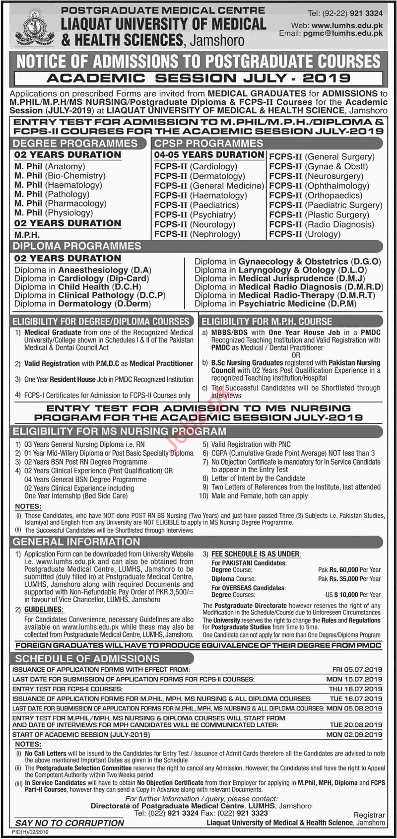 Postgraduate Medical Centre Liaquat University of Medical & Health Sciences LUMHS inviting applications from medical graduates fr admissions to M.Phil, MPH, MS Nursing, Postgraduate Diploma & FCPS-II Courses. Read newspaper ad for exact details.