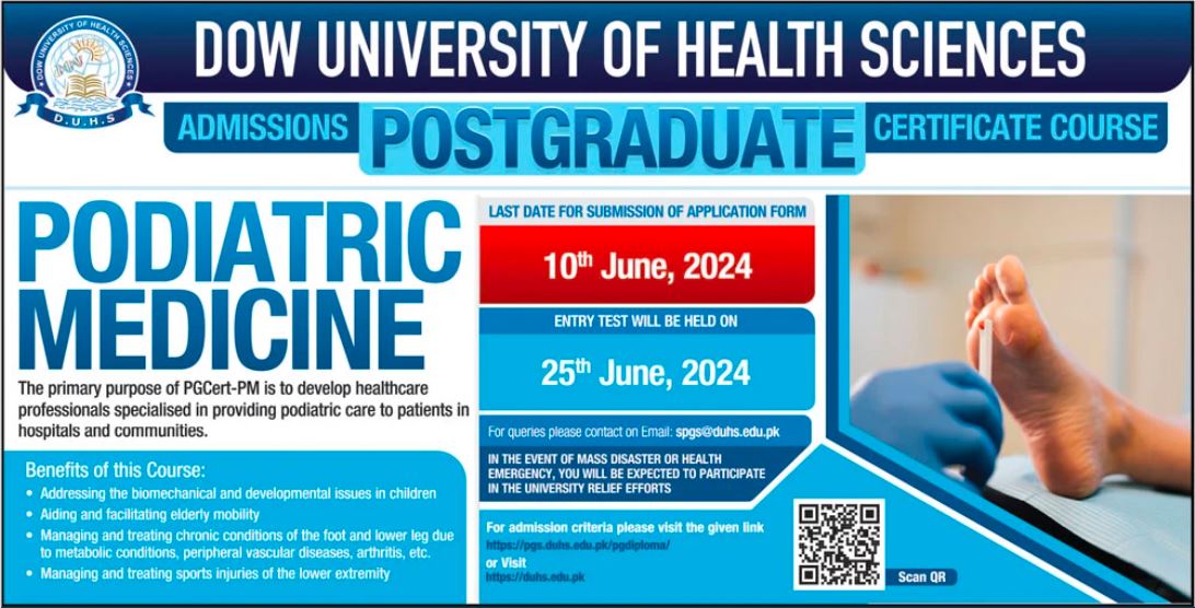 Dow University of Health Sciences FCPS Podiatric Medicine admissions 2024 has been started. Students can enroll for admissions in Dow University of Health Sciences Karachi Sindh Pakistan for academic year 2024 to continue campus based or online education in Medical University. Students who want to enroll for academic session 2024 in FCPS qualification and admission criteria for Government institute can apply till last date 10 June 2024. Read newspaper ad for exact details.