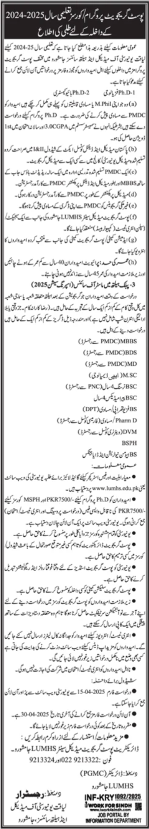 Admissions in Liaquat University of Medical & Health Sciences 2025 for Postgraduate Programs has been announced. Liaquat University of Medical & Health Sciences Jamshoro Sindh Pakistan welcomes students to apply for admissions in academic year 2025 in Science University. Students for admissions in can apply for online or campus classes as per Private institute criteria till admission closing date. Read newspaper ad for exact details.