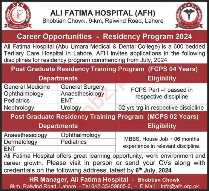 Ali Fatima Hospital AFH Lahore, lahore Punjab Pakistan invites applications from eligible candidates for the post of mcps trainee and fcps trainee as per advertisement of June 23, 2024 published in daily Roznama 92 News Newspaper. Persons with Others and MBBS etc. education can apply.