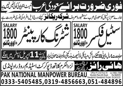 Pak National Manpower Bureau invites applications for job positions advertised in daily Express dated 8 April 2023 for following vacancies in Riyadh, riyadh Saudi Arabia.