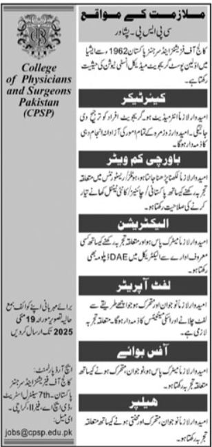 College of Physicians and Surgeons Pakistan jobs advertisement dated about 4 May 2025 in daily Mashriq Newspaper invites application for the vacant post of electrician, office boy, bawarchi cum waiter, lift operator, helper and care taker in Peshawar, peshawar Khyber Pakhtunkhwa KPK Pakistan. Preferred Education is Middle, Intermediate and Matric etc.