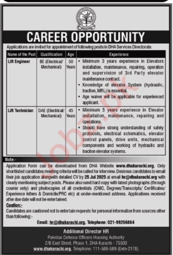 Defence Housing Authority DHA latest Government Management jobs and others can be applied till 25 July 2025 or as per closing date in newspaper ad. Read complete ad online to know how to apply on latest Defence Housing Authority DHA job opportunities.