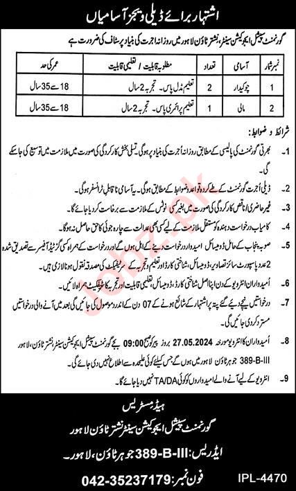 Government Special Education Centre jobs advertisement dated about 19 May 2024 in daily Express Newspaper invites application for the vacant post of mali and chowkidar in Lahore, lahore Punjab Pakistan. Candidates with Middle and Primary etc. educational background will be preferred.
