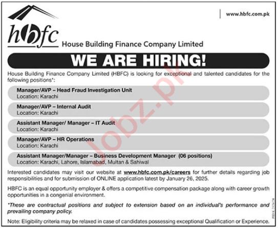 House Building Finance Company Limited HBFCL jobs advertisement dated about 12 January 2025 in daily The News Newspaper invites application for the vacant post of assistant manager it audit, head fraud investigation unit, manager it audit, manager internal audit, manager and business development manager in Karachi, islamabad, multan, karachi, lahore and sahiwal Sindh Pakistan. Persons with Master and Bachelor etc. education can apply.