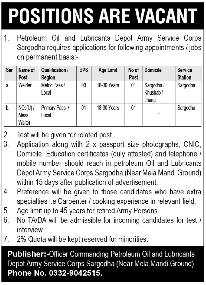 Petroleum Oil & Lubricant Depot invites applications for job positions advertised in daily Express Tribune dated 6 December 2025 for following vacancies in Sargodha, sargodha Punjab Pakistan.