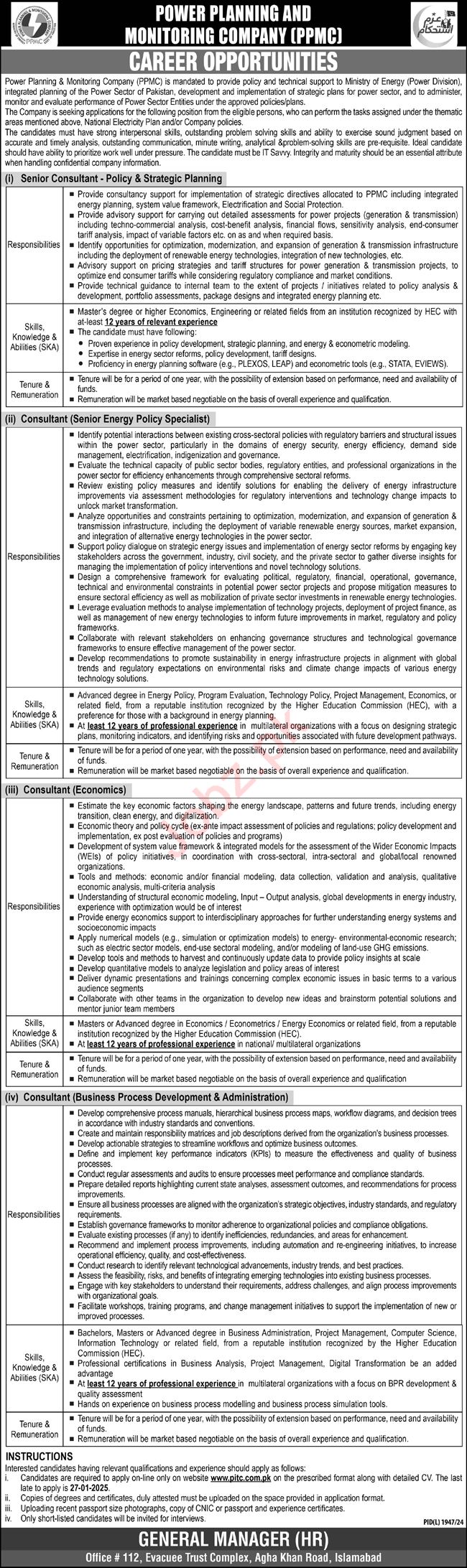 Vacant posts including consultant economics, consultant, energy policy specialist, consultant business process development administration and consultant policy strategic planning are announced in Power Planning and Monitoring Company Islamabad, islamabad Islamabad Pakistan as per 12 January 2025 advertisement in daily Nation Newspaper. Preferred Education is Bachelor and Master etc.