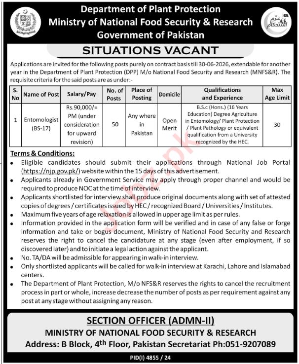 Vacancies in Ministry of National Food Security & Research MNFSR Advertisement January 2025