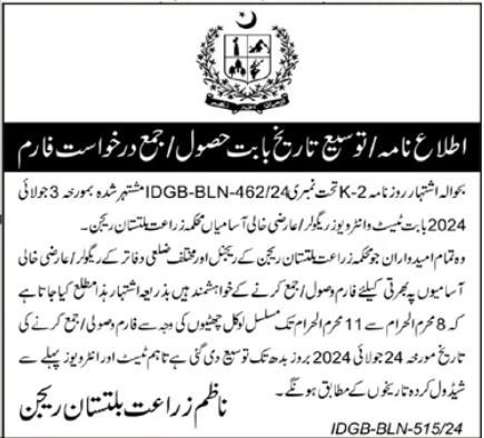 Agriculture Department invites applications for job positions advertised in daily K2 dated 19 July 2024 for following vacancies in Gilgit, gilgit and skardu Gilgit Baltistan Pakistan.