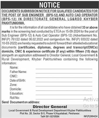 Local Government and Rural Development Department Peshawar, peshawar Khyber Pakhtunkhwa KPK Pakistan invites applications from eligible candidates for the post of auto cad operator and sub engineer as per advertisement of October 26, 2024 published in daily The News Newspaper. Persons with Intermediate and Bachelor etc. education can apply.