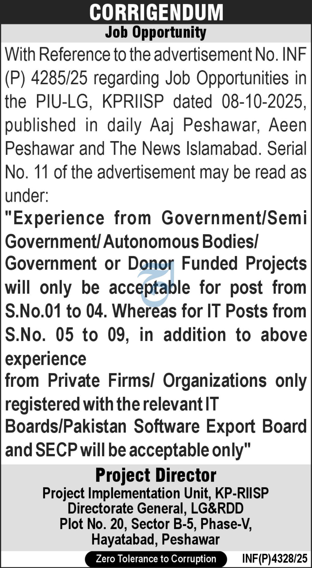 Local Government and Rural Development Department is looking for candidates for following posts as per job advertisement published in daily Aaj Newspaper of October 11, 2025 for location Peshawar, peshawar Khyber Pakhtunkhwa KPK Pakistan: