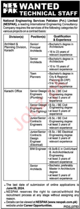 Vacant posts including architect, design engineer fire fighting, bim engineer, contract design engineer electrical, contracts engineer, principal architect, town planner and design engineer plumbing are announced in National Engineering Services Pakistan NESPAK Karachi, karachi Sindh Pakistan as per 27 May 2024 advertisement in daily Ausaf Newspaper. Educational qualifications required Bachelor and B.E etc.