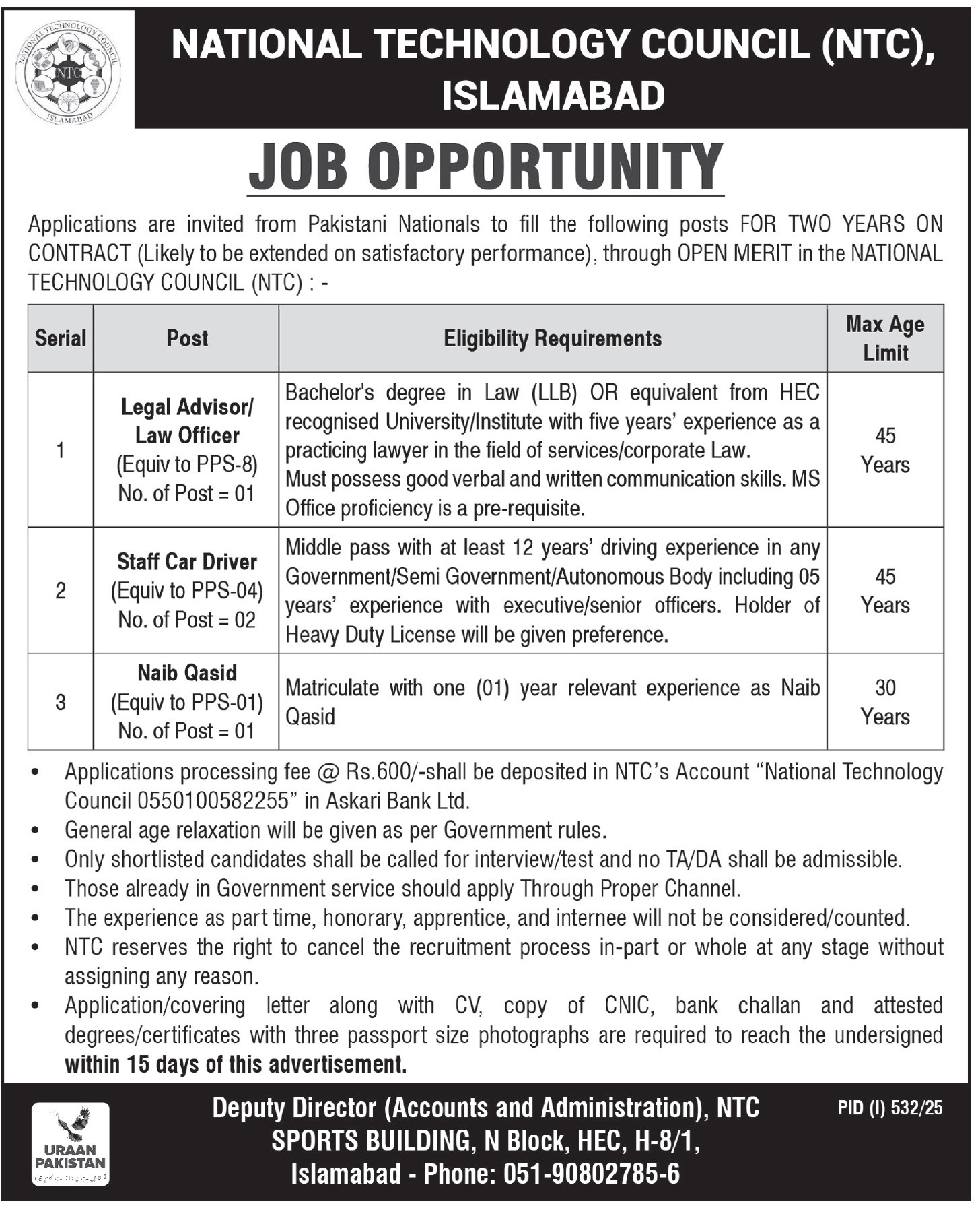 National Technology Council NTC invites applications for job positions advertised in daily Express Tribune dated 20 July 2025 for following vacancies in Islamabad, islamabad Islamabad Pakistan.