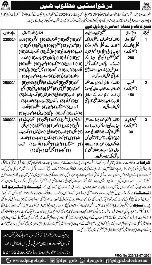 Population Welfare Department is looking for candidates for following posts as per job advertisement published in daily Express Newspaper of July 13, 2024 for location Quetta, awaran, dera bugti, pishin, kachhi, kharan, barkhan, nushki, killa abdullah, mastung, gwadar, kalat, loralai, kohlu, ziarat, jaffarabad, khuzdar, zhob, naseerabad, panjgur, duki, chaghi, quetta, killa saifullah, lasbela, sohbatpur, turbat, sibi and washuk Balochistan Pakistan:
