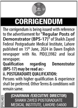 Vacant posts including demonstrator are announced in Shaikh Zayed Postgraduate Medical Institute Lahore, lahore Punjab Pakistan as per 21 June 2024 advertisement in daily Jang Newspaper. Persons with Phd, Mphil, MBBS, MS and Others etc. education can apply.