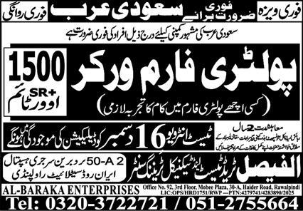 Al Faisal Trade Test & Technical Training Center jobs advertisement dated about 12 December 2025 in daily Express Newspaper invites application for the vacant post of poultry farm worker in Riyadh, tabuk Saudi Arabia. Candidates with Intermediate and Matric etc. educational background will be preferred.