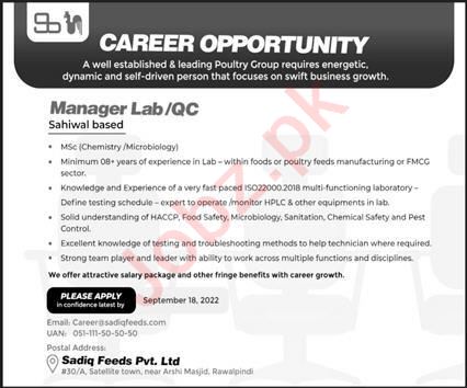 Vacant posts including manager lab and manager qc are announced in Sadiq Poultry Pvt Limited Sahiwal, sahiwal Punjab Pakistan as per 11 September 2022 advertisement in daily Express Newspaper. Candidates with M.sc and Master etc. educational background will be preferred.