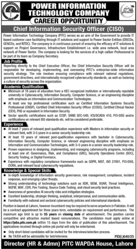 Power Information Technology Company PITC Lahore, lahore Punjab Pakistan invites applications from eligible candidates for the post of chief information security officer ciso as per advertisement of September 16, 2025 published in daily Dunya Newspaper. Master, MS and Bachelor etc. educational qualification will be preferred.