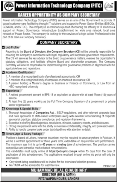 Power Information Technology Company PITC Lahore, lahore Punjab Pakistan invites applications from eligible candidates for the post of company secretary as per advertisement of July 30, 2025 published in daily K2 Newspaper. Preferred Education is Bachelor, MS and Master etc.