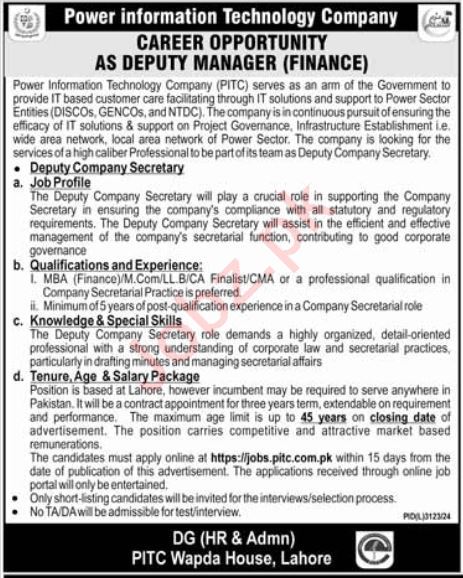 Power Information Technology Company PITC is looking for candidates for following posts as per job advertisement published in daily Jang Newspaper of May 18, 2025 for location Lahore, lahore Punjab Pakistan: