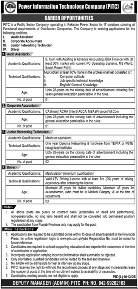 Vacancies in Power Information Technology Company PITC Advertisement October 2025