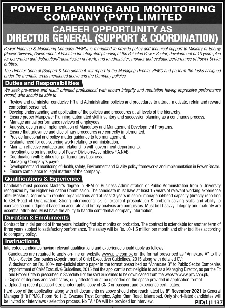 Vacancies in Power Planning and Monitoring Company Advertisement October 2021