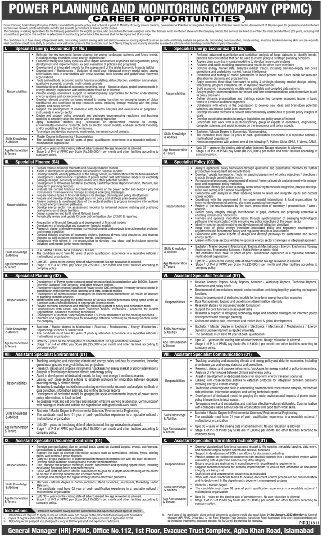 Power Planning and Monitoring Company is hiring Special Energy Economics, Specialist Finance, Specialist Planning, Assistant Specialist Environment, Assistant Specialist Document Controller, Assistant Specialist Information Technology, Assistant Specialist Communication, Assistant Specialist Technical, Specialist Policy, Specialist Energy Economics in Islamabad.