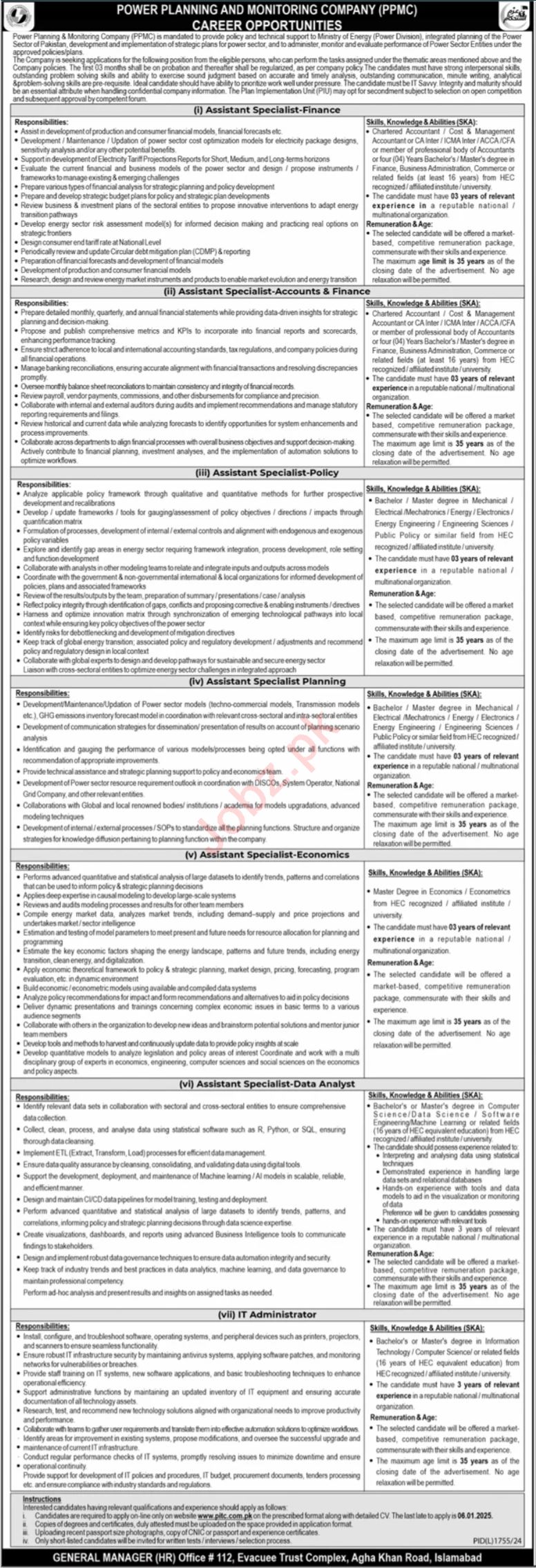 Power Planning and Monitoring Company Karachi, karachi Sindh Pakistan invites applications from eligible candidates for the post of Assistant Specialist Planning, Assistant Specialist Accounts, Assistant Specialist Finance, It Administrator, Assistant Specialist Data Analyst, Assistant Specialist Policy and Assistant Specialist Economics as per advertisement of December 23, 2024 published in daily Jang Newspaper. Preferred Education is Bachelor and Master etc.